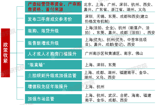 二线及热点三四线城市调控政策跟进,严查违规资金、建立二手房价格发布机制等方面均有涉及。当前在市场热度逐渐由一线城市向二三线城市传导的过程中,调控政策亦在紧急跟进,如杭州、成都、西安、嘉兴、东莞、湖州等城市均已出台相关收紧政策。