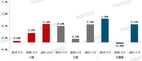 不同级别城市来看,据中指数据初步估算,2021年一季度: