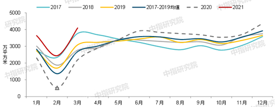 2017-2021年3月50个代表城市商品住宅月度成交面积走势