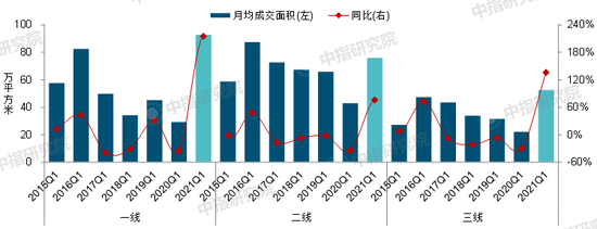 2015-2021年一季度不同级别代表城市商品住宅月均成交面积及同比走势