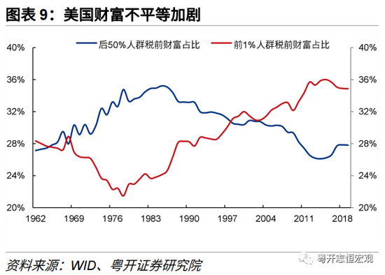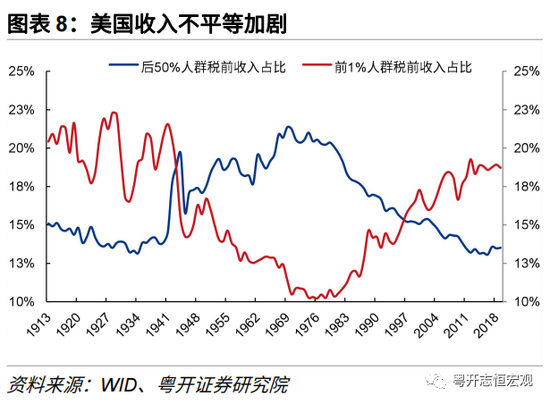 根据世界不平等数据库(WID)统计,1980-2019年,美国收入前1%的群体收入占比从10.3%上升至18.9%;而与之形成鲜明对比的是,同期美国收入后50%的群体收入占比从20.1%降低至13.5%。从社会财富分布来看,1980-2019年,美国财富前1%的群体财富占比上升了约12个百分点,美国财富后50%的群体财富占比降低了近6个百分点。美国住户收入基尼系数从1980年的0.40上升到2019年的0.48。