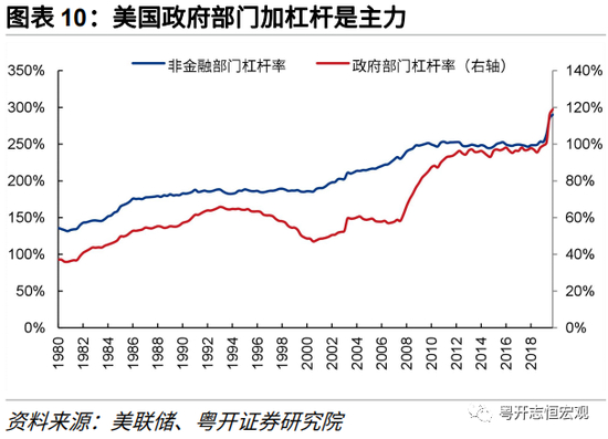 危机期间,政府需要加大财政支出力度来托底经济,但财政刺激带来的高杠杆问题日益严峻。2020年发达经济体政府杠杆率普遍大幅上升,根据国际清算银行(BIS)统计,2020年三季度美国非金融部门杠杆率较2019年末提升36.8个百分点,其中政府部门杠杆率较2019年末提升19.6个百分点。政府加杠杆明显快于居民以及企业部门。