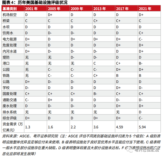 拜登基建计划更重要的经济考虑是着眼于中长期更新改造美国基础设施,进一步提升经济实力。美国在历史上曾将基建作为国家经济战略的重要组成部分,联邦政府利用资源优先配置和鼓励性财政金融政策推动基建,促成了19世纪铁路的大发展和20世纪基建的黄金期。至20世纪中叶,美国建成了世界上最为完备的基础设施体系,包括运河水系、铁路、能源系统、高速公路和民用航空网等,极大地促进了统一大市场的构建,降低了交易成本。但后期政府军事支出增加、各级政府行政效率低阻碍了基建进一步发展,美国在基础设施方面的优势不断减弱。目前的大部分基础设施都有半个世纪以上的历史,公共交通等基础设施维护状况不容乐观。但在金融危机后十余年来,联邦与州及地方政府开始重视基础设施的发展,美国的基础设施状况经历了轻微起伏和略有好转,总体提升有限。