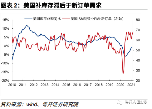 稳定经济是财政政策的重要职能,拜登选择在其推出新一轮财政刺激后不久就公布基建计划,拉动经济需求的意图明显。随着美国疫苗接种率不断提升,经济逐渐开启复苏下半场,2020年8月起美国开始主动补库存,距完全恢复仍有较大差距,未来补库存的需求仍然强劲。拜登财政刺激继续给居民直接发放补贴,美国居民可支配收入上升,推动消费与房地产需求。而未来基建计划的推出,将扩大政府投资,给原本修复强劲的国内商品消费和房地产市场提供有力支撑。当前消费品低库存的背景下,补库存需求上升,支持美国经济持续强劲恢复。