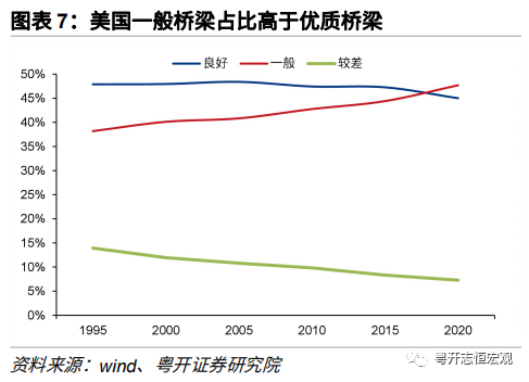 桥梁:目前在美国61.7万座美国桥梁中,有42%的桥梁使用时长超过了设计使用寿命(50年),有7.3%的桥梁功能老旧或是结构上存在缺陷。全国桥梁维修如果以目前的投资速度,将需要50年才能完成目前所需的维修,而期间又将面临新的桥梁老化问题。