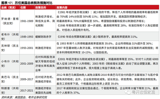 自20世纪80年代以来,美国已先后实施了多轮大规模的税制度改革。所得税率整体呈下降趋势,但减税多、加税少。里根政府上台采用了供给学派的政策主张,认为税负过高抑制了私人部门投资。里根政府在其执政期间实施了两项大规模的减税方案。而老布什总统任内经济出现了衰退,受经济全球化和国际间税收竞争的影响,再加上战争因素,美国财政导致了巨额的赤字,使得国会不得不通过1991年增税法案。