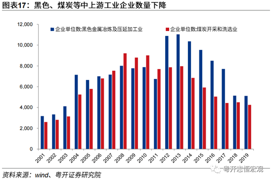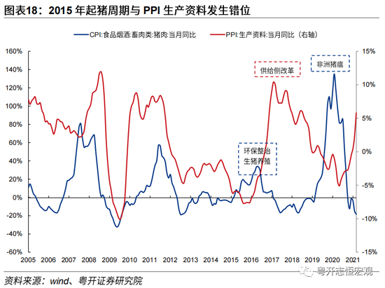 从供给端来看,环保整治和供给侧改革分别导致CPI猪周期与PPI中上游生产资料走势错位。当PPI仍处低迷时环保整治导致猪周期提前启动上升周期,当供给侧改革驱动PPI上升时生猪产能恢复猪周期开启下行周期。2000-2014年,无论是上游生产资料价格率先上涨,成本传导至终端消费推升物价,还是终端消费物价上涨、需求传导至上游PPI,CPI猪肉价格分项与PPI生产资料分项基本能够保持相同趋势。但2015年起猪周期开始与PPI中上游生产资料错位。一是2014年开始实施的生猪养殖环保整治工作,叠加《水污染防治条例》实施,造成了养猪散户集中退出、生猪存栏持续下降,叠加彼时爆发的猪丹毒疫情,共同推动猪周期自2015年初提前启动上升周期。而2015年国内外经济均面临经济下行压力,PPI生产资料仍处于下行区间。二是2016-2018年供给侧改革在淘汰落后过剩产能的同时,在客观上也导致了中上游大量中小企业的关停。2015年黑色金属冶炼工业企业数为9540家,到2018年已下降至5138家,降幅达到53.9%。钢铁、煤炭等行业产量、产能双降推动PPI在2016-2018年大幅上行。生猪存栏在此期间缓慢回升,猪肉价格在高基数基础上自2016年中开始下降,猪周期与生产资料背离进一步加剧;三是2018年非洲猪瘟疫情爆发,叠加前期环保整治层层加码持续影响、大量散户养殖退出,超级猪周期开启、猪肉价格大幅攀升。与此同时,2018-2019年在全球贸易摩擦升级、海外经济增长低迷、国内中小民企利润下降的背景下,国内经济下行压力较大,PPI由正转负。