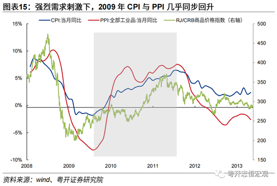 本轮国内大宗商品上涨时期,中国PPI、CPI几乎同步回升,开启新一轮“需求拉动型通胀”周期。PPI与CPI同步回升,一是在2009年“四万亿”投资与家电下乡等强刺激是一揽子计划,国内需求的扩张速度过快、力度过大,需求的扩张同时对消费品和工业品产生影响,消费终端向中上游生产环节的传导非常顺畅,几乎没有时滞。二是“四万亿”刺激计划以基建投资为主,需求直接作用在中上游产业链,跳过了终端消费价格向中上游传导的过程。