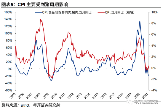 PPI与CPI在具体构成上存在较大区别,其中PPI主要受到中上游生产资料出厂价格影响,而CPI主要受到猪周期影响。CPI统计的“一篮子”商品以消费品为主,其中消费品、服务权重分别约为70%与30%,其中食品烟酒占比约为29.3%。PPI不包含服务,主要分为生产资料与生活资料,比重分别约为74%和26%。从影响因子来看,尽管食品烟酒占CPI权重逐年下降,但仍为权重最大的分项,同时食品类中猪肉受短期供给弹性较低、供给周期较长、需求刚性等因素影响,波动幅度通常较大,成为驱动CPI波动的主要因素。从历史数据看,我国猪肉价格波动和CPI波动高度相关,2008年至今,猪肉价格和CPI指数的相关系数达到0.82,远高于CPI篮子中的其他商品。PPI变动主要跟生产资料项相关,尤其是采矿业对PPI影响较大,而生活资料波动相对较小,与PPI关联度不大。