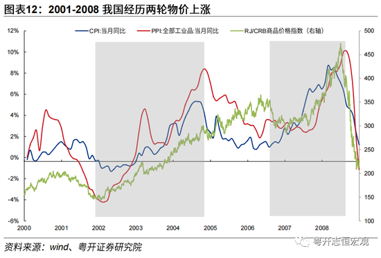 从国内物价表现来看,对应大宗商品走势,2001-2008年我国经历2轮物价上涨。其中第一轮物价上涨为较为典型的“成本输入型通胀”,具体表现为2002年初 PPI率先上涨,随后推升CPI上升。在流动性支持与经济复苏的背景下,2001年11月海外大宗商品开启繁荣周期,并推动国内PPI率先于2002年2月触底回升,带动CPI上涨。2002-2004年PPI与CPI之间的相互传导较为通畅,相关性较高,主要有三大原因:一是中国经济体量彼时相对较小,进口厂商议价能力相对较低、外贸依存度较高,易受到外界影响;二是国内市场竞争格局尚不激烈,中下游不必担心涨价影响产品销售,上游向中下游传导相对顺畅;三是国内经济向好,需求整体较强,利于PPI向CPI传导。