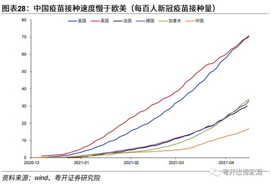 一是疫情防控不能放松,坚持外防输入、内防反弹,持续推进疫苗接种。前期我国率先控制疫情,为经济恢复、安全生产争取到宝贵的时间。但当前我国疫苗接种速度仍远慢于欧美国家,不利于后疫情时代国际联防联控、海外经贸往来的恢复。截至4月底,中国、美国、英国每百新冠疫苗接种量分别为16.95、70.16和70.91。