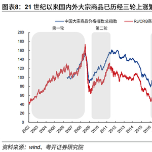 21世纪以来全球大宗商品有过三轮繁荣上涨时期,分别为2001年11月-2008年5月、2009年3月-2011年5月、2016年1月-2018年6月。推动三轮大宗商品价格上涨的主导因素不同,因此,三轮大宗商品繁荣的时间跨度、幅度以及影响也不同。其中,2001-2008年第一轮国内外大宗商品价格上涨持续时间最长,主要由需求拉动。2009-2011年国内外大宗商品价格上涨速度最快,主要由国际金融危机后刺激政策导致的流动性和需求共同推动。2016-2018年海外大宗商品价格上涨幅度最低,但国内大宗商品价格涨幅较大,主要由供给侧结构性改革带来的供给冲击推动。此外,前两轮大宗商品上涨时期,PPI、CPI均开启上升周期,而第三轮PPI上涨并未传导至CPI。