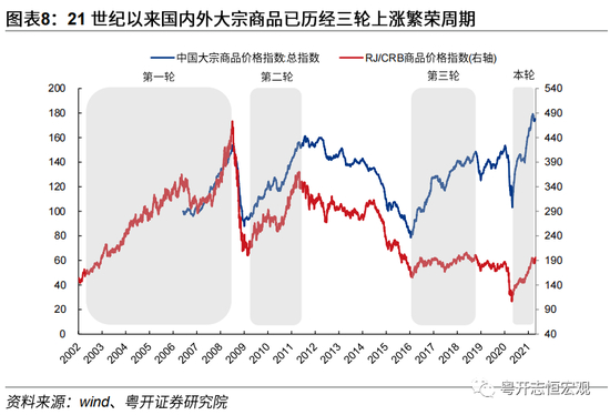 值得注意的是,受到全球资本市场一体化、经济市场一体化、期货市场价值发现功能等因素影响,国内大宗商品与海外大宗商品同步性较强、联动性较高,基本同步历经三轮上涨,但在第三轮大宗商品上涨过程中,国内涨幅显著高于海外涨幅。这主要是因为受到资本市场尚未完全开放、部分期货品种不同、国内经济与海外经济错位等因素影响,国内大宗商品走势更多受到国内供需及政策的影响。