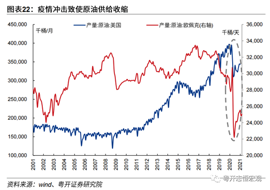 一是疫情长尾效应直接冲击生产及运输,使得全球交通航运受到干扰、甚至陷入停摆,出现全球性供给收缩,并使得大宗商品价格对需求的变动更为敏感。2020年新冠疫情在全球大面积爆发,居民生命健康受到严重威胁,实体经济从需求供给两端遭受直接冲击,不仅居民消费、旅游、教育、就医等需求被制约,同时还冲击企业开工、投资与生产,致使疫情较为严峻的地区整体经济运行直接陷入停摆。以原油生产为例,美国原油产量于2020年5月大幅回落至3.1亿桶/月,欧佩克原油日产量跌落至21世纪以来最低水平。同时,疫情长尾效应下,各国防疫政策及进度不同,使得全球经济复苏呈现“非均衡恢复”的格局,部分资源生产国疫情防控仍相对困难、同时难以获得充足疫苗、遭到疫情反扑,生产供给迟迟不能修复。以智利为例,作为铜矿和锂矿的储备量世界第一的经济体,2月以来智利确诊人数直线上升,并于4月5日宣布封国,进一步引发国际铜价大幅攀升。印度方面,突变病株叠加过早放松防疫措施,导致4月以来印度疫情再度爆发,每日新增确诊病例超30万人。作为全球重要的粮食生产国、疫苗制造国,印度疫情的爆发将进一步延缓全球生产供给的恢复。