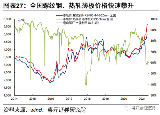 二是国内为落实碳达峰、碳中和承诺,钢铁等高耗能、高碳排放量的行业开启去产能“回头看”,执行态度及力度都相对较强,钢铁等黑色金属冶炼制造作为大气污染防治重点面临巨大减产压力。4月1日工信部提出要确保实现2021年全国粗钢产量同比下降,4月唐山钢厂产能利用率一度降至57.8%,较年初下降22.7个百分点,回到2017年供给侧改革时期水平。4月底全国高炉开工率为61.9%,仍处于近年来较低水平。与此对应的,全国螺纹钢、热轧薄板价格快速攀升,均迅速回升到2016-2017年供给侧改革时期水平。当前国内地产基建施工需求仍相对旺盛,短期内钢材市场的供需紧平衡状态难以改变。