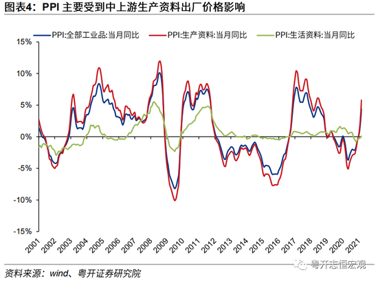 从产业链的角度来看,PPI 处于中上游生产环节,而 CPI 居于终端消费环节,两者存在相互的传导反馈关系:若物价上涨主要从PPI传导至CPI,则为成本推动型物价上涨,若从CPI传导至PPI则主要表现为需求拉动型物价上涨。根据产业链理论,上游原材料作为投入品,是下游产成品的成本。这意味着当受到供给冲击的时候,上游原材料价格的上涨,将沿着产业链向中下游加工工业品传递,最终带动终端消费品CPI滞后性上涨,即成本推动型物价上涨。反过来,当终端消费需求旺盛时,由于企业扩产投资需要一定时间,供给端弹性低于需求端,需求旺盛将引发CPI先行上涨,并沿着产业链向上传递,带动中上游工业品PPI滞后地发生相应的变动,即需求拉动型的物价上涨。