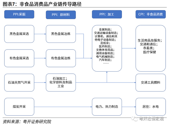更进一步,PPI 向 CPI 的产业链传导主要存在食品加工和非食品消费品两条路径,其中非食品消费品是PPI向CPI传导的主要途径。