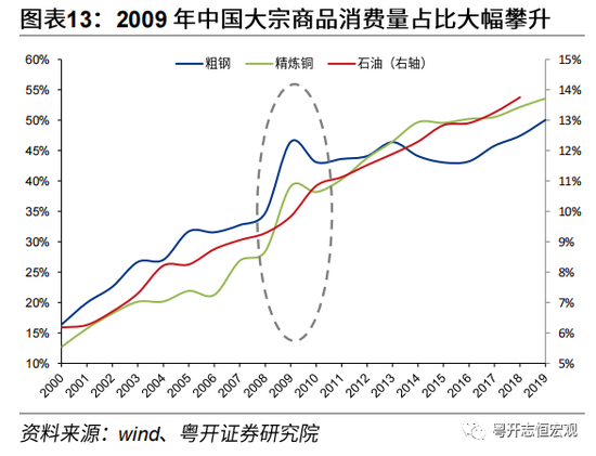 另一方面,2001年11月中国正式加入WTO,以开放包容姿态深度融入全球贸易体系,带动国内经济迅猛发展,2008年中国城镇化率达到47%,较2000年提高10.8个百分点。国内城镇化及工业化进程加速、固定资产投资高增使得以黑色、有色金属为代表的大宗商品需求持续性上升。尤其是以2006年为分界点,全球经济增长动能加速从欧美向中国转换,中国占全球GDP同比依次超越英国、德国、日本,成为世界第二大经济体,对铜、石油、粗钢等大宗商品消费量再上台阶,2008年中国对石油、精炼铜、粗钢的消费量占全球比重为9.3%、28.4%和34.7%,分别较2000年提升3.0、12.7和14.7个百分点。