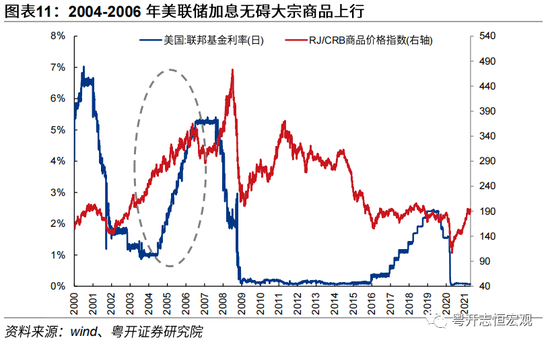 此外,值得注意的是,尽管流动性是影响大宗商品价格的重要因素,但2004-2006年美联储进入加息周期,期间大宗商品整体仍维持上涨趋势,表明流动性支持仅是大宗商品价格上升的必要条件之一。伴随美国经济逐步过热、通胀压力上行,2004-2006年间美联储17次上调基准利率,联邦基金利率从1%大幅上升至5.25%。与此同时,全球经济尤其是中国经济维持高速增长,美联储加息仅影响大宗商品上涨的速度而未改变上涨趋势,2004-2006年CRB商品价格指数仍趋势性上涨32%。