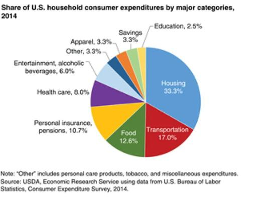 支出结构可以反映一个国家的富裕程度,下图分别是欧盟与美国的家庭支出结构。要说明的一点是,两者的支出结构不可比,因为用的指标不一样:欧盟支出结构里,食堂、出差、餐厅的食品消费单列,美国没有列;美国把储蓄列进去,欧盟没有列。但是,可以看到美国和欧盟的恩格尔系数都比较低,应该在20%以下。