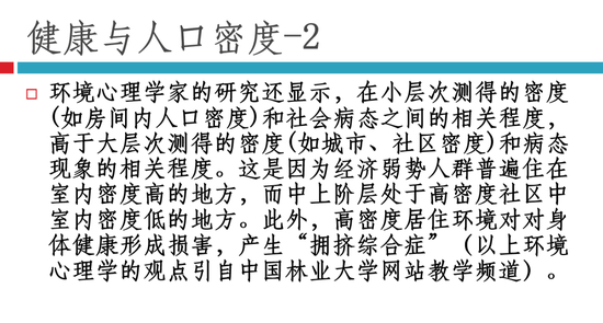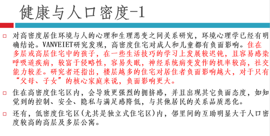 我们的居住形态还有其他的一些问题,特别是这个居住形态对我们的心理健康影响特别大。这方面文献很多,可能做环境心理学的学者对这个问题比较熟悉,一般在讨论城乡关系、讨论住宅建设问题当中,不太注意这个事。这方面研究有很多重要结论,在这里给出一些他人研究的结论:住的越密,对心理的负面影响越大。