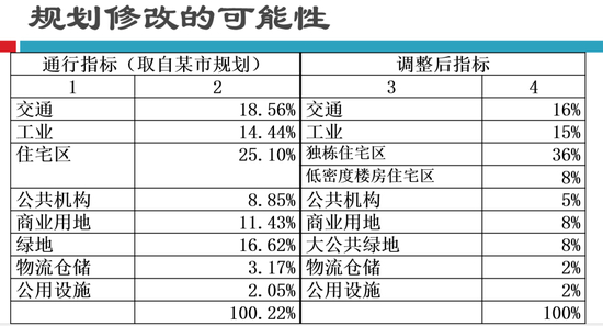 人们最关心的问题,究竟有没有这么多的土地?宏观看土地没什么问题,真正要考虑的问题是修订规划,通过规划的调整立刻就柳暗花明。在这里给出一个左边两列数据是一个城市(不说哪里),实际情况是这样,右边两列是调整后的指标,我自己根据假设的可能性做调整。如果做出这个调整,欧美一般土地使用结构,65%的居民住独栋住宅,土地是没有问题的。