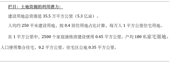 农村地区的土地浪费也非常厉害,做一个推论,考虑农村的空置房、废弃的宅基地,几个方面的因素加起来,推算大概有4000万亩农村建设用地没有利用。这个用地如果用来通过增减挂钩的办法来扩大城市居住用地的供给,当然是非常重要的资源。