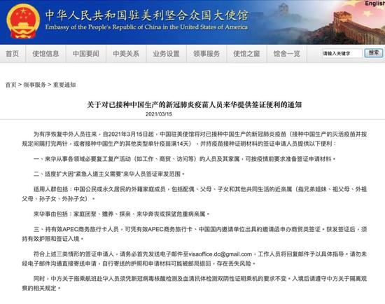今年3月,外交部发言人在例行记者会上表示:“自2021年3月15日起,中方对已接种中国生产的新冠肺炎疫苗,并持疫苗接种证明材料的外籍人员提供来华签证便利。”