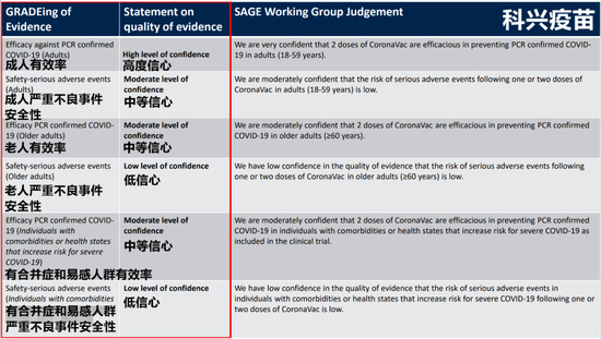 需要注意的是,低信心并不是说存在问题,无论是老人还是有合并症人群,临床试验都没有出现严重不良反应。但是面向这些人群的临床试验数据太少,所以WHO对于得出“防护有效”或“无副作用”的结论信心不足。