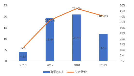 在补贴和电价双双下降的情况下,2018年开始,分布式光伏的新增装机容量下降,2019年新增了12.2GW,在各类光伏中占比从2007年的47.4%下降到40.5%。