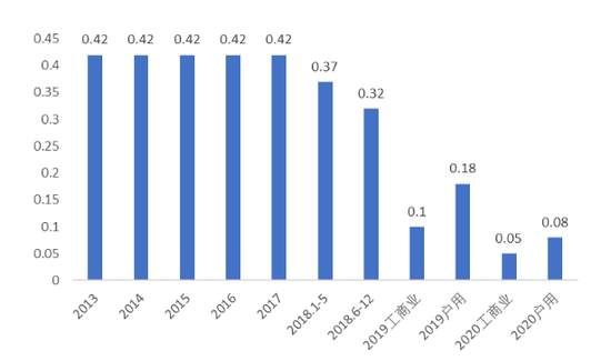2020年4月2日,国家发展改革委印发《关于2020年光伏发电上网电价政策有关事项的通知》规定: “自发自用、余电上网”模式的工商业分布式光伏项目补贴标准为每千瓦时0.05元;户用分布式光伏补贴标准调整为每千瓦时0.08元。相较于2019年,“自发自用、余电上网”模式的分布式光伏项目的补贴标准每千瓦时下调0.05元,降幅为50%;户用分布式光伏补贴标准下调0.1元,降幅为55.5%。