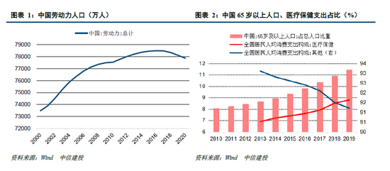 从居民医疗保健(器具、药品、服务)消费可见一斑,2000-2020年,日本家庭人均消费支出下降1.8%,而人均医疗保健消费支出大幅增长39.6%,也是各类消费支出中增速最快的领域。2013-2020年,我国人均消费支出增长60%,人均医疗保健消费支出增长102%,也是增长最快的方向。“十四五”时期我国老龄化进一步加速,加之此次会议提出多项发展措施和政策支持方向,各类老龄产业加快发展的确定性较高。
