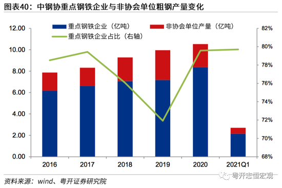 唐山等限产地区的供给缺口由非限产地区钢企补充,部分地区的行政限产政策只会改变全国钢厂之间的分配。2018年蓝天保卫战启动以来,不同地区不同类别的企业限产政策执行环节的力度不同,在产量结构变化上有所体现。非限产钢企挤出了重点钢企的产量,重点钢铁企业产量占比在2018、2019年连续下行。2021年钢价上涨使得钢厂利润大幅改善,钢厂生产意愿提升,非限产区域钢企产量大幅提升。而河北唐山等限产地区钢厂受到行政管制,唐山钢铁集团4月粗钢产量同比大降31.7%,今年1-4月粗钢产量累计同比下降18%。假设唐山地区钢厂都按30%比例限产,这将意味着河北省今年可能将降低粗钢产量至少3000万吨,由此引发限产地区企业与非限产地区企业之间的利益再分配,华东、华南等非限产区域的钢铁企业将受益。