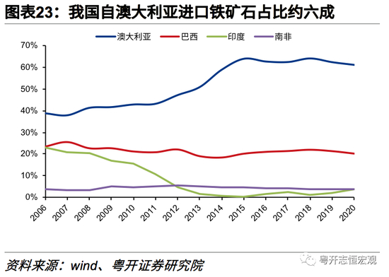 我国铁矿石进口依赖度高,澳大利亚是最重要的进口来源。我国钢铁企业偏重长流程工艺、国内铁矿石品位低、采掘成本高共同导致我国铁矿石大大依赖进口。从2006年我国自澳大利亚进口铁矿石占比逐渐攀升至60%以上,主要受益于FMG和Rio Tinto的增产。在全球钢材需求增长背景下,国内外生铁产量增加,而铁矿石供给增量相对有限,供需偏紧叠加流动性宽松,铁矿石价格持续上涨。2020年我国进口铁矿石量价皆升,全年共进口铁矿石11.7亿吨,比上年增长9.5%;全年进口均价为101.65美元/吨,同比提高7.2%;进口额1189亿美元,比上年增长17.8%。根据2020年我国生铁产量8.84亿吨,需消耗折合62%品位的铁矿石13.97亿吨,而全年进口铁矿石11.7亿吨,由此计算出我国铁矿石对外依赖度超过80%。钢铁产业链利润前置,矿山寡头垄断使得铁矿石采矿利润占产业总利润的七成以上。我国钢企集中度不高,对铁矿石议价能力低,铁矿石价格弹性高于钢价,铁矿石价格是影响钢铁企业利润的最重要的因素。