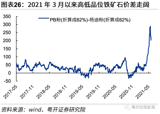 在焦炭库存下降的背后是钢厂高利润,驱动高品位铁矿石与废钢的需求增加。焦炭在高炉冶炼中作为燃料的同时把铁矿石还原成生铁。经验显示,高炉冶炼时入炉矿石含铁品位每提高1%,焦炭比约下降2%,生铁产量约提高3%;矿石含铁品位越低,则渣量越大,焦炭消耗越高。一方面,在超高利润的的环境下钢厂有了采购高品位矿石的资金,进口铁矿石的高低品位价差大幅攀升。另一方面,焦炭与铁矿石价格大幅度上涨使得钢厂长流程路线的成本优势减弱,短流程电弧炉炼钢的经济性增强,带动了废钢需求的提升,而废钢供给受限使得废钢价格居高不下。