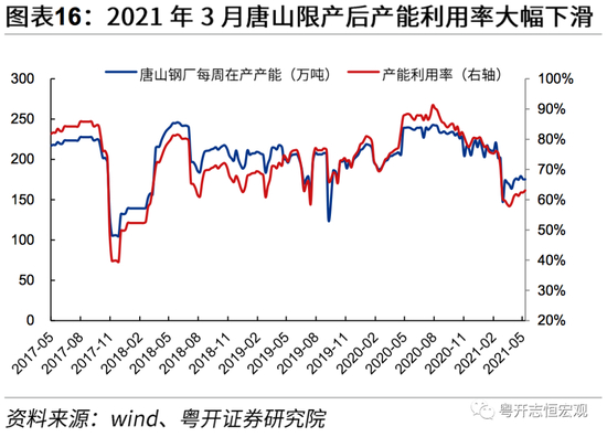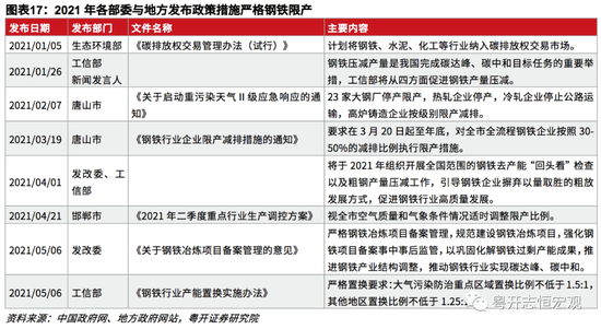 短期行政式的供给限产执行力度都相对较强,全国钢材价格已远远超出2016-2017年供给侧改革时期水平。其一,国家减碳限产的长期目标短期化,不断加强限产预期。碳达峰碳中和是中长期战略目标,我国将用10年、40年的时间有序推进“30·60”目标实现。钢铁行业初步定为2025年前实现碳排放达峰,钢铁行业的碳达峰时点规划超前于“30·60”全局性目标。鉴于钢铁行业在制造业中的支柱地位,钢铁行业实现碳达峰将对其他工业能够起到示范效应,这一定程度上诱导了钢铁限产短期执行节奏加快,长期减碳目标执行短期化。其二,地方行政式环保限产政策执行力度较强,时空范围有扩大趋势。今年以来,河北唐山地区环保限产政策频繁加码,除了常规的冬季污染天气应急响应实施分级限产之外,还在3月始执行力度进一步升级,对钢厂逐个生产环节采取有针对性的限制措施,限产常态化覆盖到全年。河北邯郸4月宣布根据空气质量对全市钢铁企业实施不同比例的限产,时效持续到6月末,环保限产的地区有扩大趋势,增大了市场对供需缺口预期。此外,今年发改委、工信部在钢铁行业开启去产能“回头看”,市场担忧针对违规产能可能引发的限产。2021年5月工信部发布新的钢铁产能置换管理办法,明确要求京津冀、长三角等大气污染防治重点区域严禁增加钢铁产能总量。若限产范围进一步扩大、执行力度进一步加码,钢材价格或将进一步上涨。