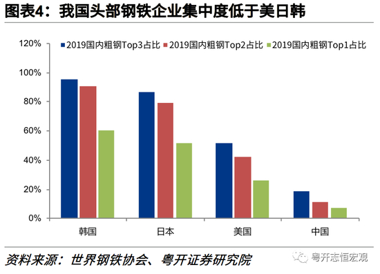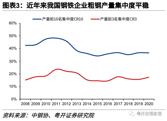 2、产业结构上,钢铁产业集中度低,行业资源整合空间大。碳中和为我国钢铁产业集中度提升带来新的机遇,行业资源整合后有助于提升钢企进口铁矿石时的议价能力,保障供给的稳定性,提高发展的安全性,预防输入性通胀风险。从横向比较来看,2019年美国、日本、印度和韩国钢铁产业产量前3家企业的产业集中度(CR3)在50%至90%之间,而中国钢铁产业集中度CR3仅为17.3%。从纵向比较来看,截至2020年末,中国钢铁行业CR10集中度为36.8%,较2016年仅提高0.8个百分点,与2016年工信部发布的60%目标相距甚远。长期以来,钢铁行业存在制约产业集中度提升的三大因素。一是钢铁企业的地方政府管理特征阻碍了大规模跨区并购;二是融资能力不足,限制了钢铁企业发起整合并购的能力;三是钢铁企业同质化竞争,经营者缺乏并购动力。