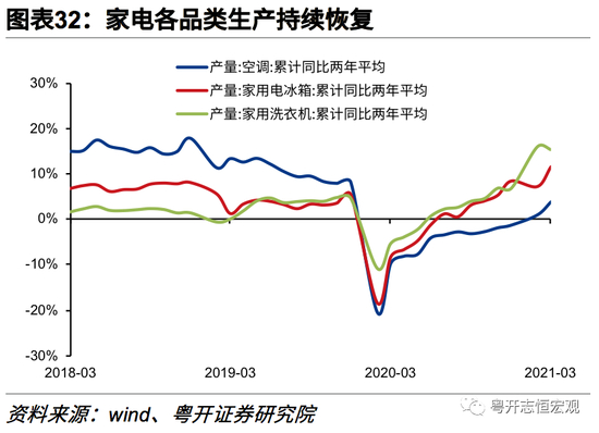 家电方面,原材料的快速上行对行业毛利润的构成压制。家电行业钢材占成本的比例约20至30%,主要是附加值较高的板材,如果钢价持续维持高位,将对企业采购原材料以及接受订单产生影响。特别是家电出口占比高的企业,虽然受到地产后周期景气度高的刺激,海外消费需求高涨,但面临的钢材等其他原材料的成本压力,若无法完全向海外市场平移,将被迫转向国内市场,从而导致总体销量不及预期。反过来影响到采购环节,在高钢价的环境中,产品出口高的家电企业可能被迫减少订单,减少钢材采购。内销相对乐观,2021年1-3月,家用电冰箱产量累计达2157.8万台,同比增长54.6%,相对2019年的同比复合增速为8.4%;家用洗衣机产量2144.7万台,同比增长50.7%,相对2019年的同比复合增速10.8%,产销持续改善。下半年,内销景气叠加海外复苏有望继续刺激家电用钢增长。