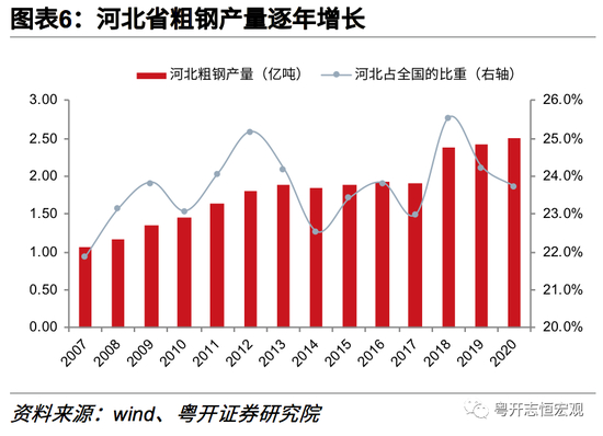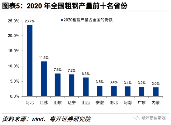 3、区域结构上,炼钢企业地域布局不平衡,河北等重点地区面临的减碳压力较大,减碳限产可能带来区域经济发展压力。今年碳中和的全国性政策机制与实施路线逐步成形,还需要对钢铁生产重点领域的重点地区予以政策支持,保障经济的稳健运行。从区域分布看,一是我国钢铁生产主要集中在北方,而钢铁需求主要集中在南方。2020年河北省粗钢产量接近2.5亿吨,占全国炼钢产量的23.7%,位居全国首位,是第二名江苏省的两倍。二是河北省内钢铁生产分布也不均衡,唐山市钢产量占全省总产量50%以上,邯郸市钢产量占比约20%。
