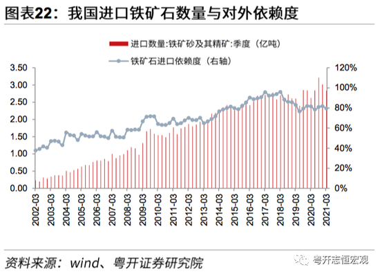我国钢铁行业当前上游成本较高,下游需求强支撑。供应端,铁矿石是我国钢铁行业的最主要的成本项,我国铁矿石进口依赖度高,海外疫情叠加贸易冲突扰动导致铁矿石供给增量相对有限,在全球钢材需求增长背景下,供需偏紧叠加流动性宽松,铁矿石价格持续上涨,我国长流程钢厂面临较大的成本压力。焦炭、废钢等原材料供应相对紧张,高品位铁矿石与废钢的需求也在增加。需求端在整体宏观经济复苏的驱动下不断恢复,当前国内地产基建施工需求仍相对稳健,海内外制造业景气度共振上行,对国内钢厂高钢价、高利润构成支撑。