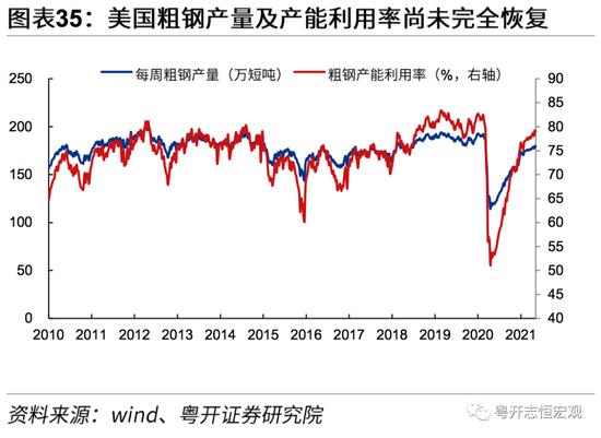随着海外钢材需求大幅增长,而供给恢复速度相对慢于需求爆发速度,供需错配导致钢材价格加速上涨。2021年3月,全球除中国外粗钢产量增至7520万吨,同比增加10.6%,较2019年同期低1.3%。目前来看,海外粗钢产能利用率仍在爬升阶段,整体尚低于疫情前水平。以美国粗钢产能利用率为例,2020年5月初最低跌至51.1%,随后缓慢回升,10月末升至70%以上水平,截至2021年5月1日,产能利用率达到78.7%,较2019年同期低3.6个百分点。