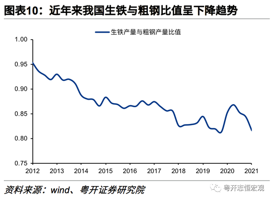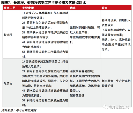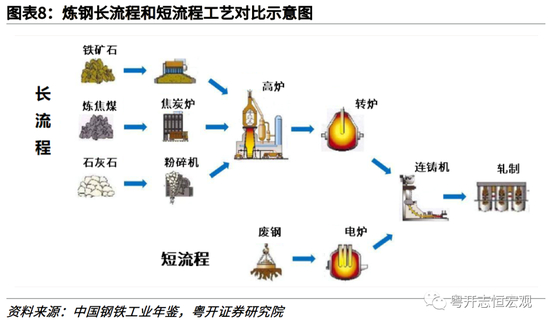 4、生产工艺上,钢铁生产工艺流程长,碳排放量相对较高。我国长流程炼钢工艺的生产原料主要是铁矿石、焦煤等,同时生产过程中由于前期投入资金较大,一旦开工高炉不能停工,焦煤炼化对环境污染较为严重。当前我国长流程转炉炼钢的产量占比接近90%,显著高于全球平均的71.6%。钢铁的低碳发展要求炼钢工艺的创新发展,未来以废钢为原材料、以电弧炉为的短流程炼钢厂占比将逐步上升,这将有助于降低我国对铁矿石的依赖,规避国际铁矿石价格冲击带来的输入性通胀风险。