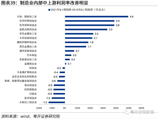 原材料上涨可能加剧上游行业与中下游行业之间的盈利分化。当前高钢价、高利润利好上游钢铁企业,2021年1-4月规模以上钢铁行业的利润总额1529.8亿元,同比增超4倍,利润率为5.2%,高于去年同期的1.6%和去年底的3.4%。随着上游原材料价格上涨,中下游议价能力较弱的制造企业利润受到侵蚀。今年制造业多数行业利润率普遍修复,但是包括钢铁在内的中上游利润率的涨幅明显高于下游制造业。2021年一季度中上游行业中石油煤炭、有色金属、黑色金属加工业利润率较2019年同期分别提升4.9、2.2、1.7个百分点;而下游行业中纺织服装、家具制造业利润率分别下降0.9、1.0个百分点。
