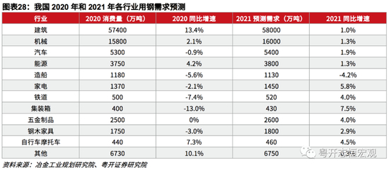 预计2021年钢材消费增长仍将延续,但幅度会有所收敛。本轮钢价上涨离不开下游需求的稳健增长的支撑。2020年疫情危机后经济复苏,钢材消费快速增长、促进钢铁产能快速释放。2021年经济恢复性增长延续,制造业设备投资有望进入上行周期,基建和房地产投资基本持稳,我国钢铁需求将平稳向好。冶金工业规划研究院发布的《2021年中国钢铁需求预测成果》报告显示,预计2021年中国钢材需求量为9.91亿吨,同比增长1.0%,需求变化整体平稳,增幅较去年有所下降。