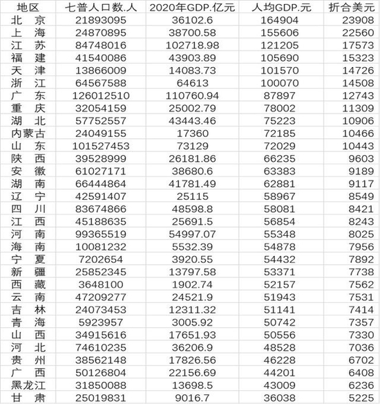 有媒体计算出了各省的人均GDP,结果显示,全国31省中,6省人均GDP超10万元,分别是北京、上海、江苏、福建、天津和浙江。其中,京沪超过15万元,重庆、湖北的人均GDP在中西部地区领跑。