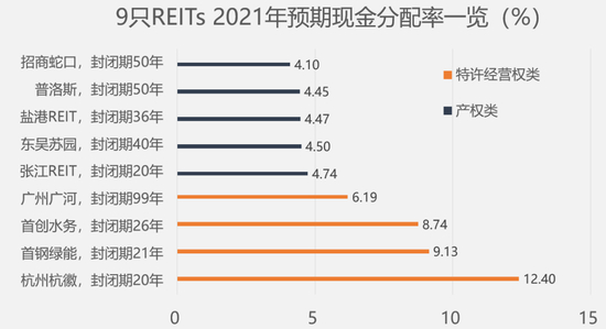没产权的REITs分配率稍微高些。广河高速公路还能收费99年,所以分配率低一些,预计有6.19%。最高的沪杭高速公路分配率超过12%,因为它的封闭期最短,还剩20年到期。