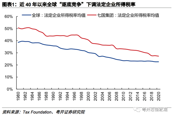 1、80年代以来,市场理念复归,美国里根减税、英国撒切尔夫人放松管制、中国改革开放背景下放权让利。为吸引企业投资,全球主要经济体纷纷下调企业所得税,开展“逐底竞争”,发达国家下调企业税率的幅度更大。1980-2020年间,全球法定企业所得税率算术平均值累计下行16个百分点至22.6%,而G7国家企业所得税率算术平均值累计下行23.3个百分点至27.2%。