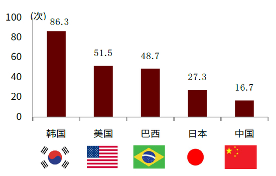 图表:中国每千人接受美容诊疗次数(2019)