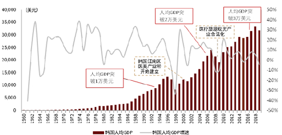 ①需求端:人均GDP快速成长为医美产业发展提供需求支撑。朴正熙时代韩国“汉江奇迹”使得工业化与现代化进程持续推进,带动经济高速发展,并使得韩国跻身“亚洲四小龙”之一。至1994年,韩国人均GDP首次突破一万美元,1970-2000年间韩国人均GDP复合增速为13.4%,经济高速发展为医美产业崛起提供了支撑。