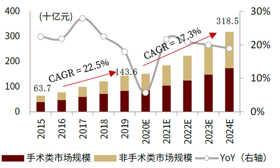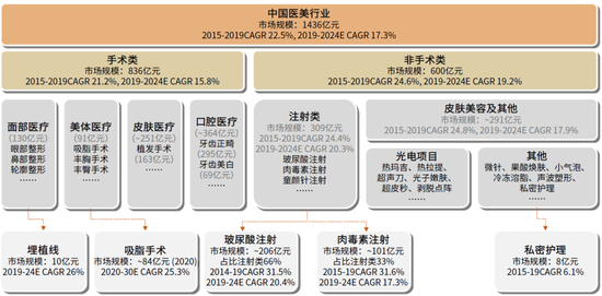 医美项目按照是否需要手术,可以划分为手术类、非手术类(又称轻医美)两个大类。其中,手术类项目(2019年市场规模约836亿元,下同)包含面部医疗(眼鼻等面部轮廓整形,130亿元)、美体医疗(胸臀等身体轮廓整形,91亿元)、皮肤医疗(植发等,约251亿元),口腔医疗(牙齿正畸等,约364亿元)等类目;而非手术类项目(600亿元)又称轻医美,包含注射类(玻尿酸、肉毒素等,309亿元)、皮肤美容及其他(光电类、声波类、私密护理等,约291亿元)。